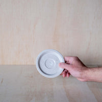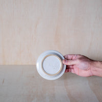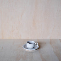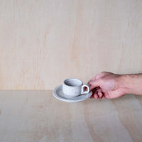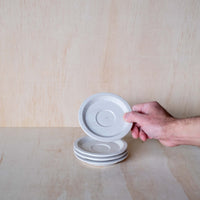 A hand-thrown ceramic saucer, in a white glaze. Designed to sit beneath a Stacking Espresso Cup. Made from an iron-bearing buff clay body that reveals a light speckle. Crafted by hand in Aotearoa New Zealand.