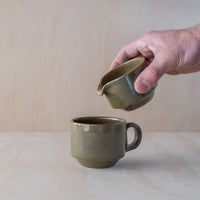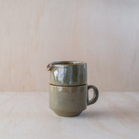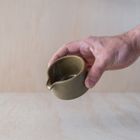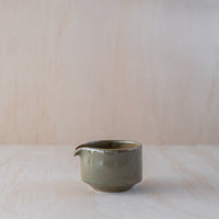 A hand-thrown ceramic pourer, in a green glaze. Made from an iron-bearing buff clay body that reveals a light speckle. Crafted by hand in Aotearoa New Zealand.