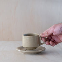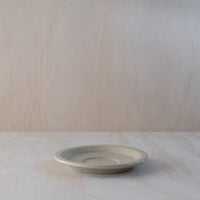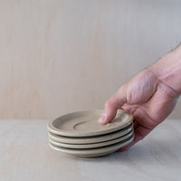 A hand-thrown ceramic saucer, in a sand coloured glaze. Made from an iron-bearing buff clay body that reveals a light speckle. Crafted by hand in Aotearoa New Zealand.