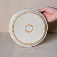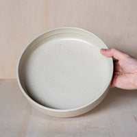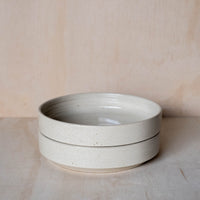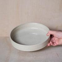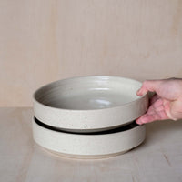 A large hand-thrown ceramic stacking bowl, in a beige glaze. Great for serving or for use as a fruit bowl. Made from an iron-bearing buff clay body that reveals a light speckle. Crafted by hand in Aotearoa New Zealand.