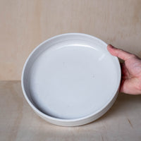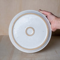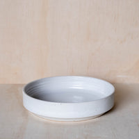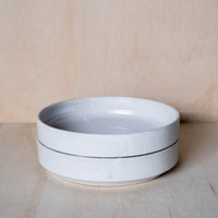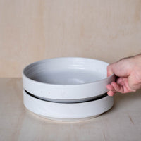 A large hand-thrown ceramic stacking bowl, in a white glaze. Great for serving or for use as a fruit bowl. Made from an iron-bearing buff clay body that reveals a light speckle. Crafted by hand in Aotearoa New Zealand.