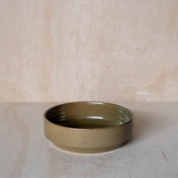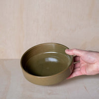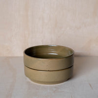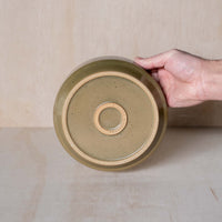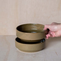 A hand-thrown ceramic stacking bowl, in a green glaze. Ideal for dinners, salads and serving. Made from an iron-bearing buff clay body that reveals a light speckle. Crafted by hand in Aotearoa New Zealand.
