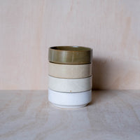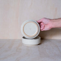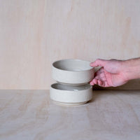 A hand-thrown ceramic stacking bowl, in a beige glaze. Ideal for breakfast, soup and serving. Made from an iron-bearing buff clay body that reveals a light speckle. Crafted by hand in Aotearoa New Zealand.