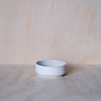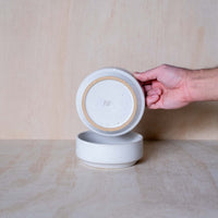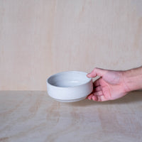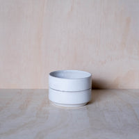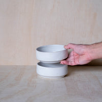 A hand-thrown ceramic stacking bowl, in a white glaze. Ideal for breakfast, soup and serving. Made from an iron-bearing buff clay body that reveals a light speckle. Crafted by hand in Aotearoa New Zealand.