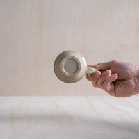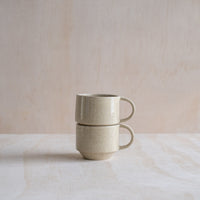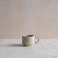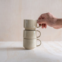 A hand-thrown ceramic stacking mug, with a "C" shaped handle, in a sand coloured glaze. Made from an iron-bearing buff clay body that reveals a light speckle. Crafted by hand in Aotearoa New Zealand.