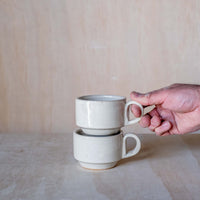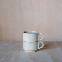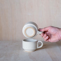 A large, hand-thrown ceramic stacking mug, in a beige glaze. Made from an iron-bearing buff clay body that reveals a light speckle. Crafted by hand in Aotearoa New Zealand.
