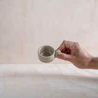 A hand-thrown stacking espresso cup, in a beige glaze. Made from an iron-bearing buff clay body that reveals a light speckle. Crafted by hand in Aotearoa New Zealand.