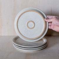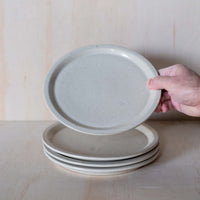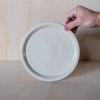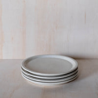 A hand-thrown ceramic lunch plate, in a beige glaze. Made from an iron-bearing buff clay body that reveals a light speckle. Crafted by hand in Aotearoa New Zealand.