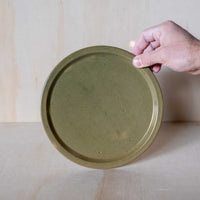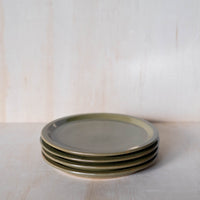 A hand-thrown ceramic lunch plate, in a green glaze. Made from an iron-bearing buff clay body that reveals a light speckle. Crafted by hand in Aotearoa New Zealand.