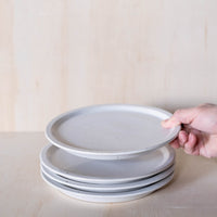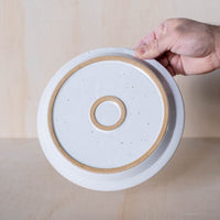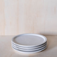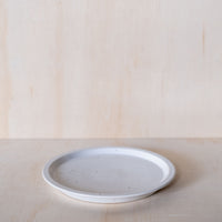 A hand-thrown ceramic lunch plate, in a white glaze. Made from an iron-bearing buff clay body that reveals a light speckle. Crafted by hand in Aotearoa New Zealand.