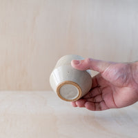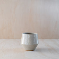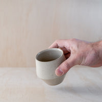 A hand-thrown ceramic tumbler with angled sides, in a beige glaze. Made from an iron-bearing buff clay body that reveals a light speckle. Crafted by hand in Aotearoa New Zealand.