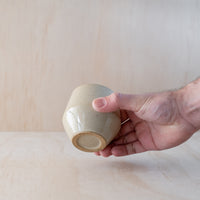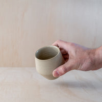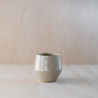 A hand-thrown ceramic tumbler with angled sides, in a sand coloured glaze. Made from an iron-bearing buff clay body that reveals a light speckle. Crafted by hand in Aotearoa New Zealand.