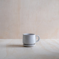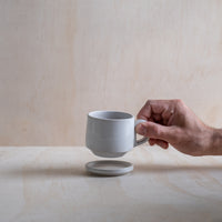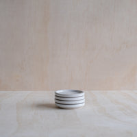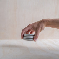 A hand-thrown ceramic coaster, in a white glaze. Made from an iron-bearing buff clay body that reveals a light speckle. Crafted by hand in Aotearoa New Zealand.