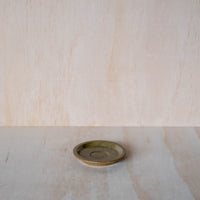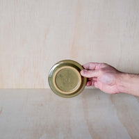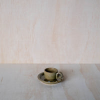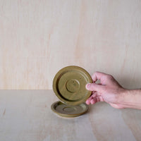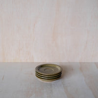 A hand-thrown ceramic saucer, in a green glaze. Designed to sit beneath a Stacking Espresso Cup. Made from an iron-bearing buff clay body that reveals a light speckle. Crafted by hand in Aotearoa New Zealand.