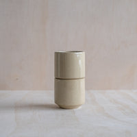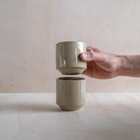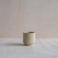 A tall, hand-thrown ceramic tumbler, in a sand coloured glaze. Made from an iron-bearing buff clay body that reveals a light speckle. Crafted by hand in Aotearoa New Zealand.