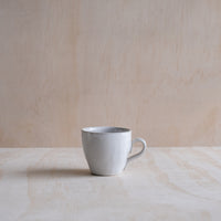 A hand-thrown ceramic tulip cup, in a white glaze. Made from an iron-bearing buff clay body that reveals a light speckle. Crafted by hand in Aotearoa New Zealand.