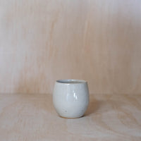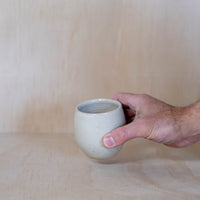 A hand-thrown ceramic wine tumbler, in a beige glaze. Made from an iron-bearing buff clay body that reveals a light speckle. Crafted by hand in Aotearoa New Zealand.