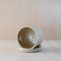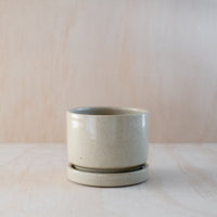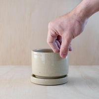 A hand-thrown planter with matching saucer, in a sand coloured glaze. Features a small hole in base for drainage. Made from an iron-bearing buff clay body that reveals a light speckle. Crafted by hand in Aotearoa New Zealand.