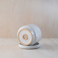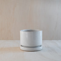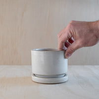A hand-thrown planter with matching saucer, in a white glaze. Features a small hole in base for drainage. Made from an iron-bearing buff clay body that reveals a light speckle. Crafted by hand in Aotearoa New Zealand.